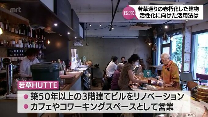 また、こちらの若草HUTTE(ヒュッテ)も築50年以上のビルをリノベーションし、カフェやコワーキングスペースとして営業しています。