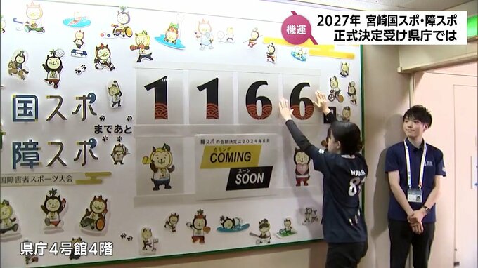 MRT SPORTS UP! 開催まで1166日 「2027国スポ」宮崎開催正式決定 県庁に懸垂幕やカウントダウンボード 2024年7月17日(水) 19:22 国内 国スポ開催決定を受け、宮崎県庁には、17日、懸垂幕やカウントダウンボードがお目見えしました。(垣内沙耶記者)「国スポ開催決定を受け、県庁には今懸垂幕が掲げられています」県庁8号館の壁に登場した大きな懸…