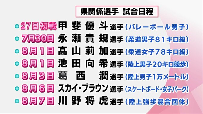 陸上では、男子20キロ競歩の池田向希選手が8月1日、男子1万メートルの葛西潤選手が8月3日、競歩混合団体の川野将虎選手が8月7日の出場します。