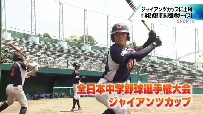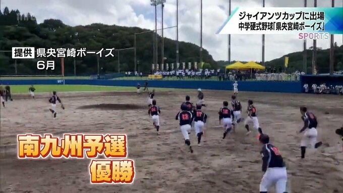 6月、「県央宮崎ボーイズ」は南九州予選で優勝し、「全日本中学野球選手権大会ジャイアンツカップ」に出場しています。