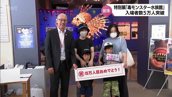 毒モンスター水族館 来場者5万人を突破 2024年8月23日(金) 17:09 国内 宮崎市の県総合博物館で開かれている特別展「毒モンスター水族館」の入場者数が5万人を突破しました。5万人目の来場者となったのは、国富町から訪れた宮永さん家族です。23日は、記念セレモニーが行われ、千聖くん…