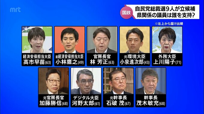 自民党総裁選が告示 過去最多となる9人が立候補する しれつな選挙戦 宮崎県関係の自民党国会議員は誰を支持する 2024年9月12日(木) 19:00 国内 暮らし・マネー 自民党総裁選挙が、12日、告示され、過去最多となる9人が立候補しました。今後の国政に大きく関わる今回の総裁選。宮崎県関係の自民党国会議員は誰を支持するのか聞きました。12日、告示された自民党総裁選挙。過…
