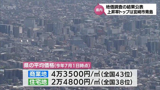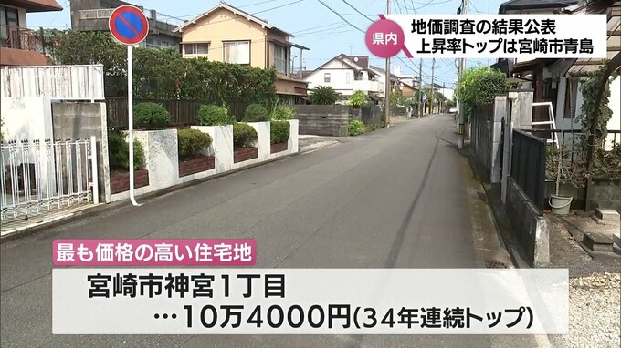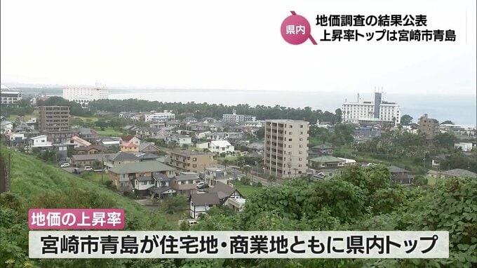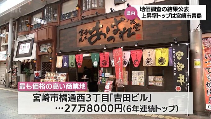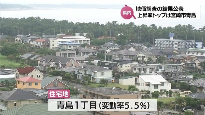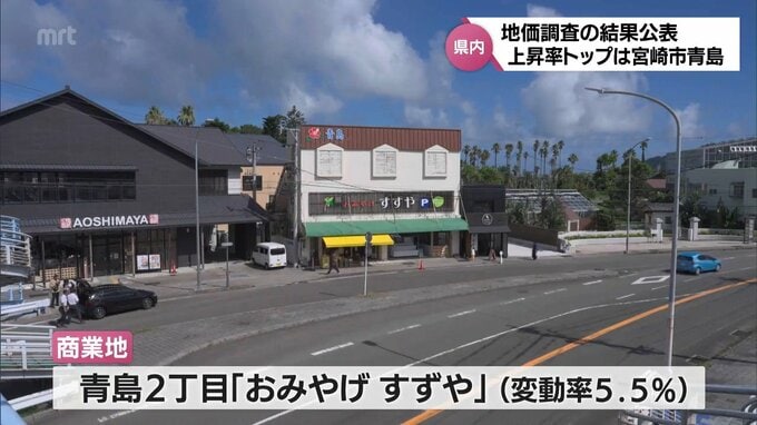 また、地価の上昇率は、商業施設の新規出店が相次ぐ宮崎市青島が住宅地・商業地ともに県内トップとなり、住宅地が青島1丁目で変動率5.5%、商業地が青島2丁目の「おみやげすずや」で変動率5.5%となっています。