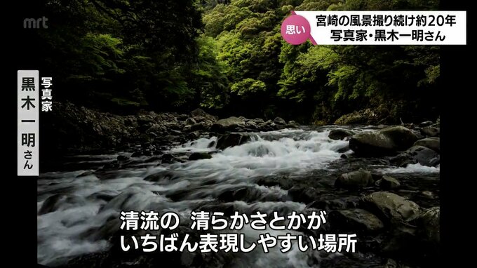 撮影ポイントを見つけると、川のせせらぎの中、シャッターを切る黒木さん。