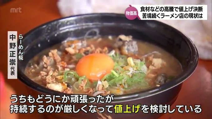 さまざまな食材の値上がりなどで多くのラーメン店で苦しい状況が続いていて、値上げを決断した店も出ています。現状を取材しました。