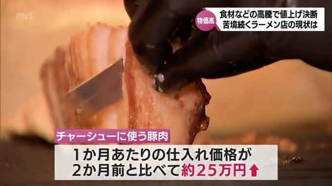 チャーシューに使う豚肉は、1か月あたりの仕入れ価格が2か月前に比べおよそ25万円上がっています。
