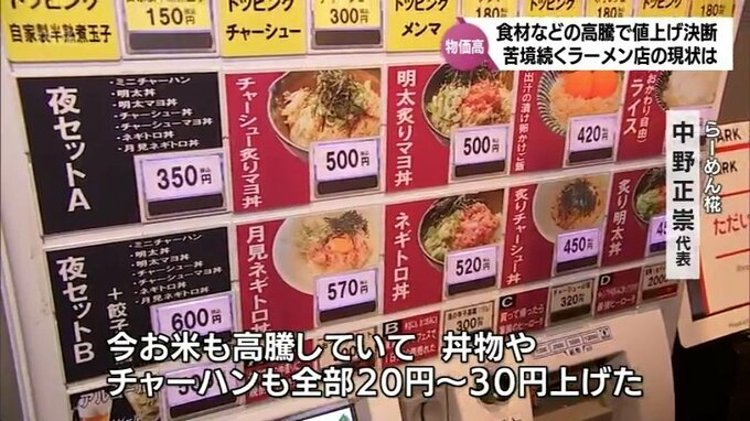 「今、お米も高騰していまして、丼物だったりとか、チャーハンも全部、20円、30円上げさせていただいた」