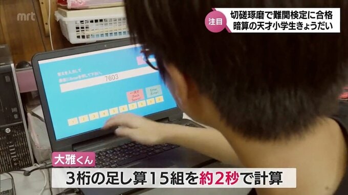 画面上に出る数字を瞬時に計算するもので、大雅くんは3桁の数字の足し算で15の組み合わせをわずか2秒ほどで計算することができます。