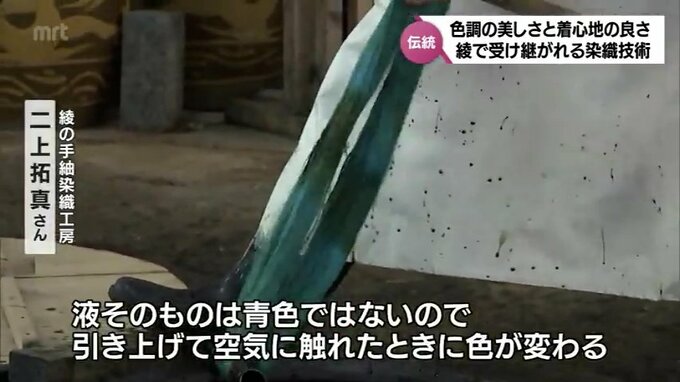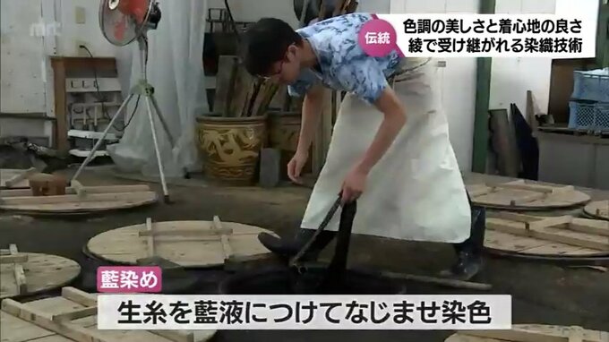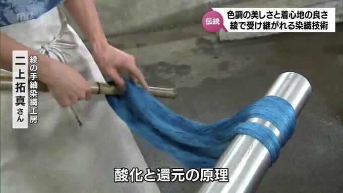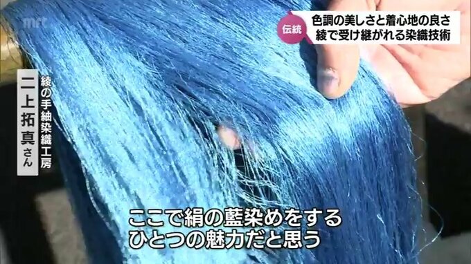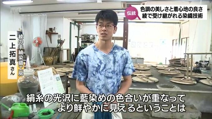 「この絹糸の光沢に藍染めの色合いが重なって、より鮮やかに見えるというのは、ここで絹の藍染めをする、ひとつの魅力なんじゃないかなと思います」