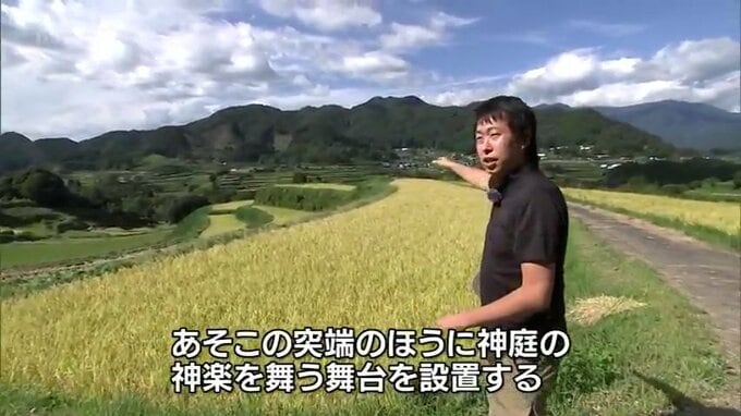「棚田夜神楽は、ここが舞台になりまして、あそこの突端の方に神庭の神楽を舞う舞台を設置します」