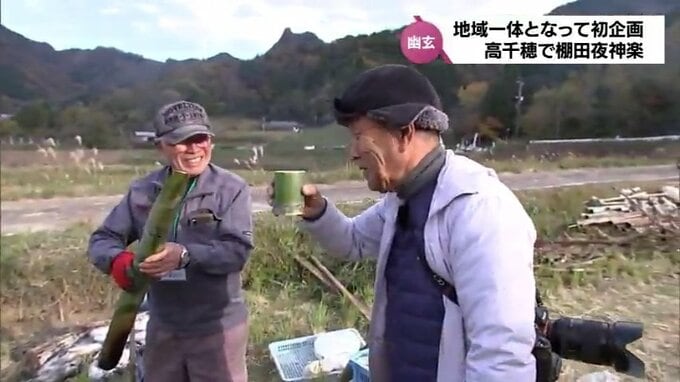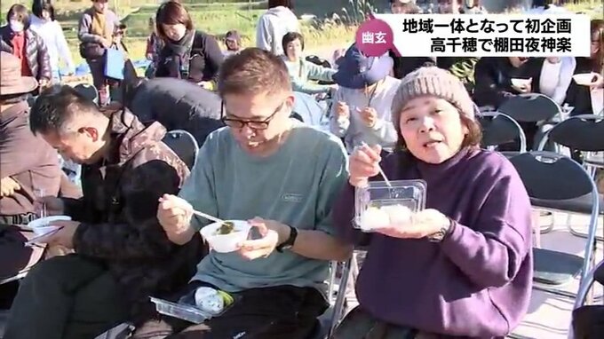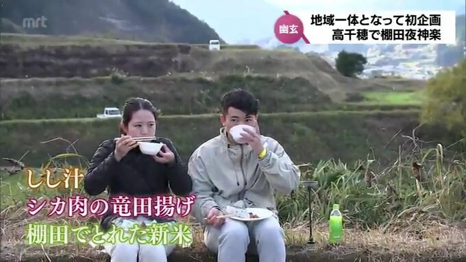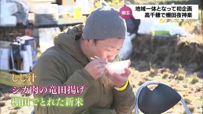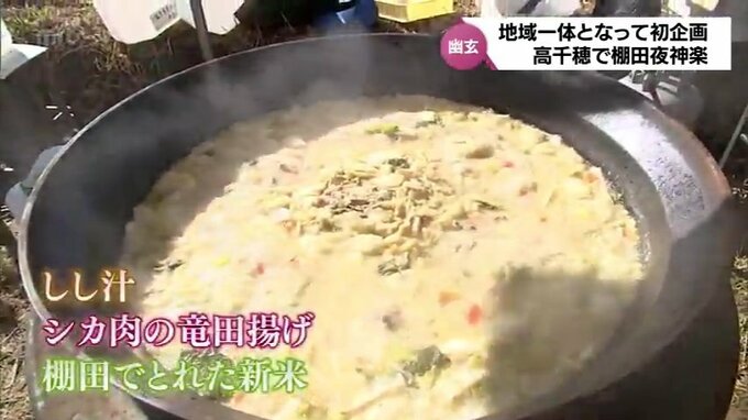 観客には、本番前、しし汁やシカ肉の竜田揚げ、それに、棚田で獲れた新米のふるまいも。
