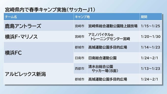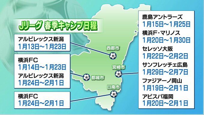 J1のチームは、鹿島アントラーズなど6チームが宮崎市で、横浜FCとアルビレックス新潟も都城市などで行います。