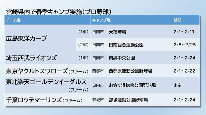 また、都城市では巨人の3軍と、今年から新たにロッテのファームのキャンプが実施されます。