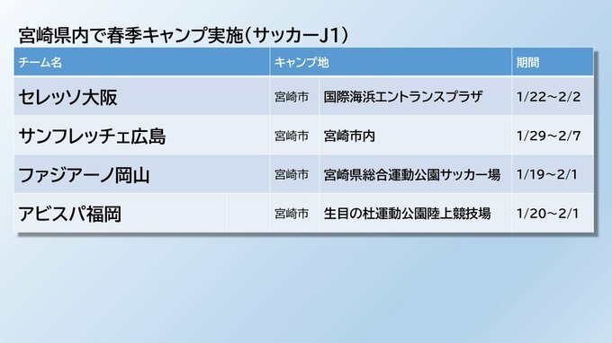宮崎県内は、今年、プロ野球8球団とJリーグ16チームが春季キャンプを行います。