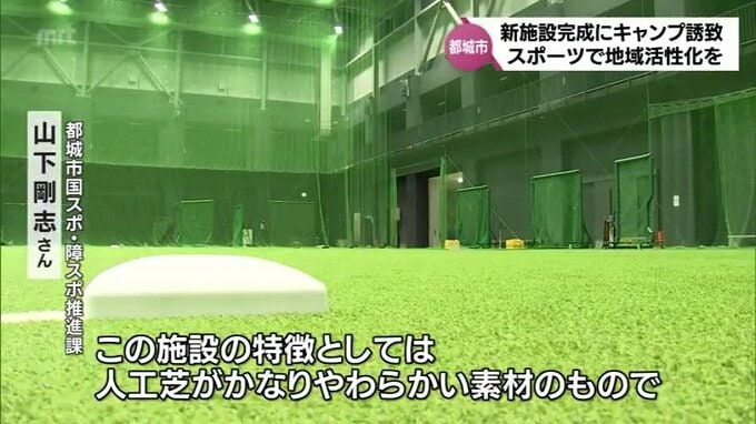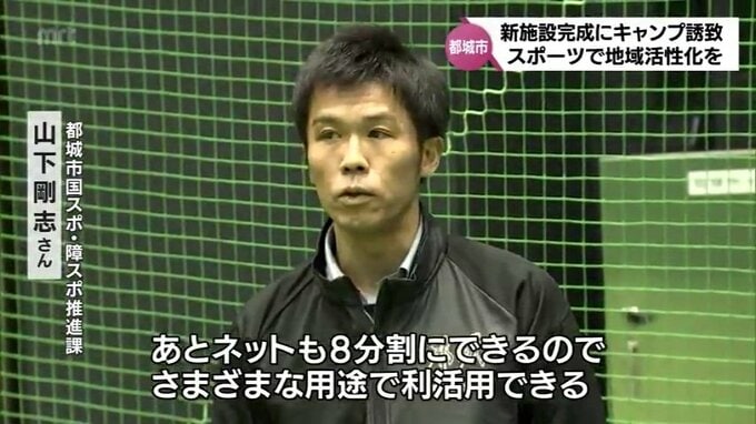 「この施設の特徴としては人工芝がかなりやわらかい素材のもので、利用者の足に負担の少ないような素材になっている。ネットも8分割にできるので、さまざまな用途で利活用できる」