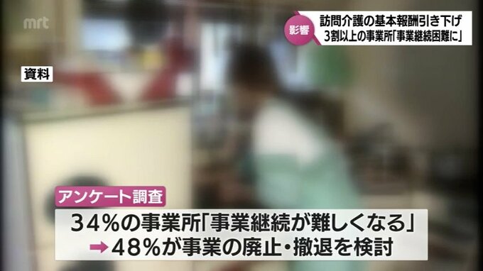 3割以上が基本報酬の引き下げで事業継続が困難に 報酬見直しを訴え 宮崎県内の訪問介護事業所の関係者が会見 2025年2月26日(水) 19:39 国内 暮らし・マネー 訪問介護の基本報酬の引き下げで、宮崎県内の訪問介護に大きな影響が及んでいます。26日、県内の訪問介護事業所の関係者が会見を開き、基本報酬の見直しを訴えました。県内でアンケート調査に答えた訪問介護事業所…