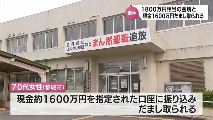宮崎県都城市の女性が1800万円相当の金塊と、現金1600万円をだまし取られる事件がありました。