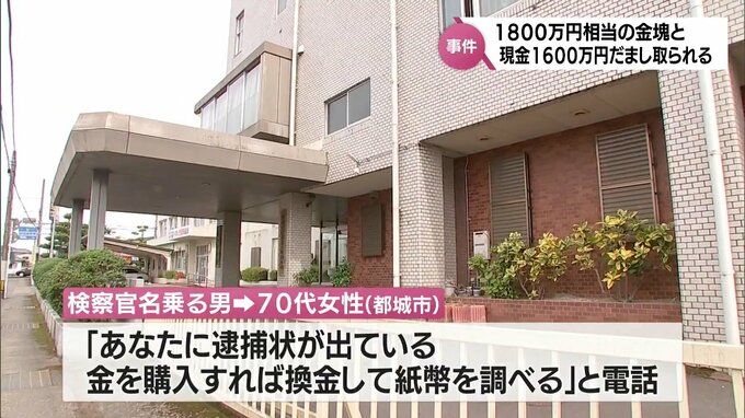 その後、検察官を名乗る男から、「あなたに逮捕状が出ている。金(きん)を購入してもらえれば、換金して紙幣を調べる」と電話があり、女性はおよそ1800万円相当の金塊を購入。