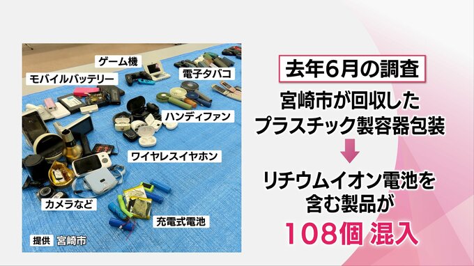 去年6月の調査では、市内で収集した「プラスチック製容器包装」のごみに、モバイルバッテリーやワイヤレスイヤホンといったリチウムイオン電池を含む製品が1か月間で108個混入していたそうです。