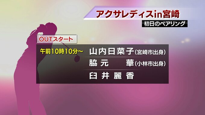 同じく宮崎市出身の山内日菜子と小林市出身の脇元 華 はディフェンディングチャンピオンの臼井麗華と10時10分アウトスタートです。