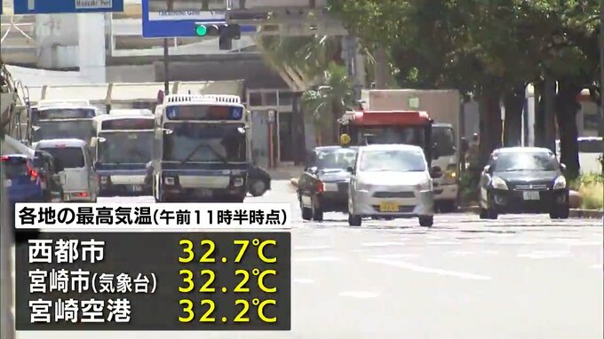 西都市で32.7℃など 宮崎県内各地 午前中で「真夏日」に 35℃以上の予想も 熱中症に注意を(17日午前11時半現在) 2025年6月17日(火) 12:06 国内 天気 宮崎県内は、きょうも午前中から各地で気温が30℃を超えていて、熱中症に警戒が必要です。(17日午前11時半現在)きょうの県内は、西風と日差しの影響で、南部平野部を中心に気温が上昇しています。各地の午前11時半…