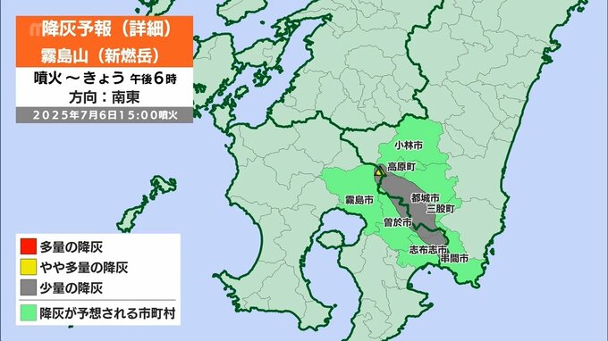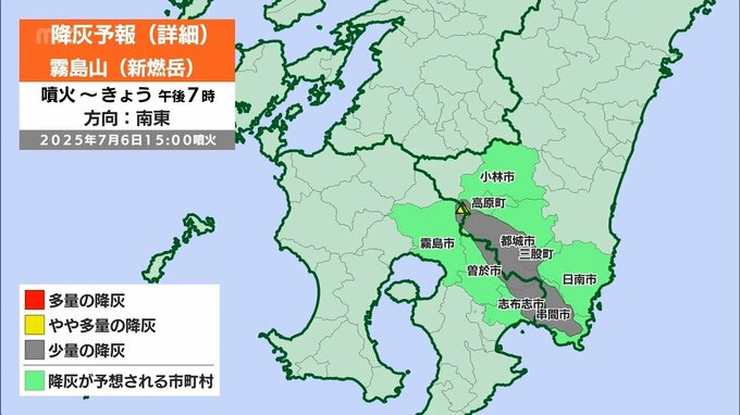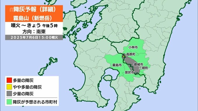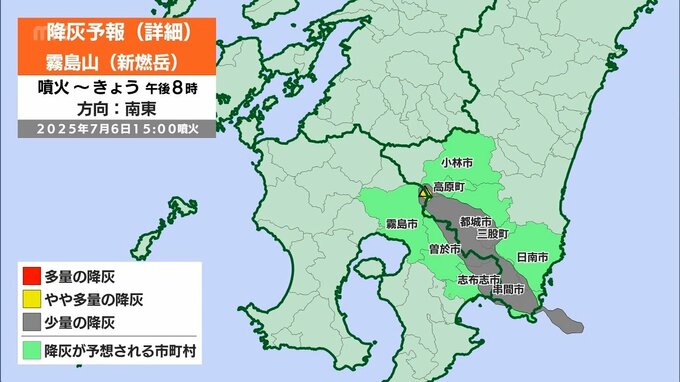 火山灰は南東方向に流され、午後9時までに小林市と都城市ではやや多量の降灰が予想されています。