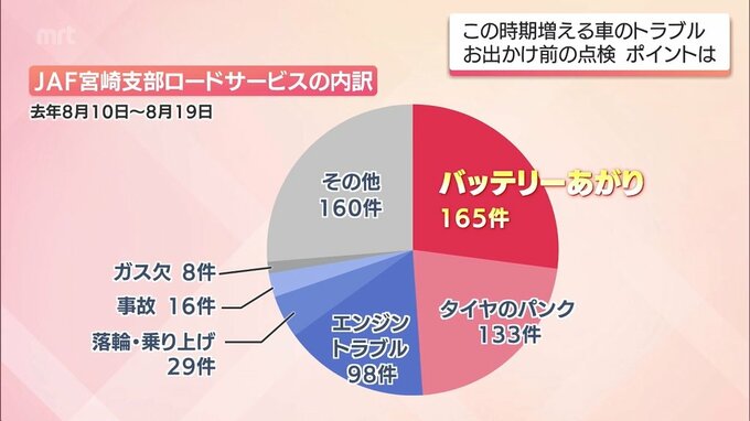 盆の入り 車のチェックは大丈夫? バッテリー上がりや車のパンク トラブル防ぐ点検のポイント 2025年8月12日(火) 19:00 国内 暮らし・マネー 長期休みで増えるのが車のトラブルです。JAF日本自動車連盟は、バッテリー上がりやタイヤのパンクなどを起こさないためにお出かけ前の点検を呼びかけています。JAF宮崎支部では、去年、お盆の期間の10日間に609件…