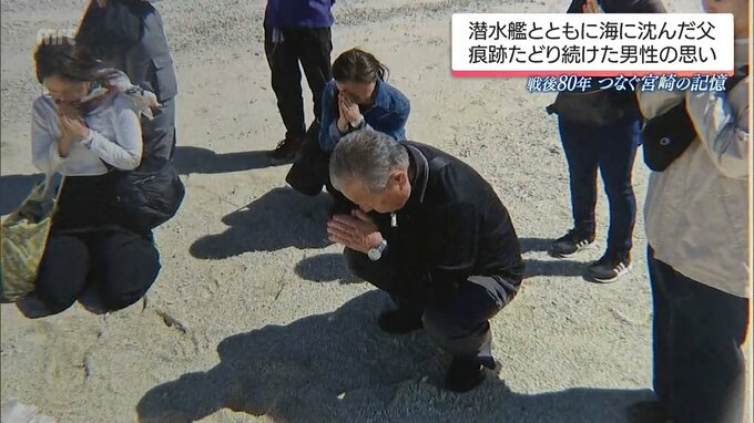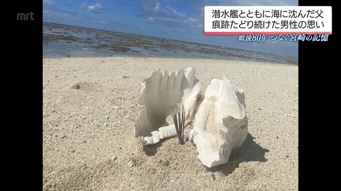 アメデ島では、砂浜に線香を手向け、父親の肇さんをしのびました。