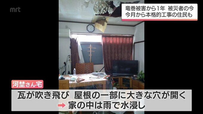 竜巻の影響で瓦がほとんど吹き飛んで屋根の一部に大きな穴が開き、家の中は水浸しになりました。