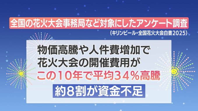 その結果、物価高騰や人件費の増加の影響で、花火大会の開催費用は、この10年で平均34%高騰しているということです。