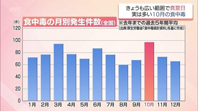 宮崎県内各地で真夏日に 10月に多い食中毒の発生 予防に注意を 2025年10月8日(水) 19:00 国内 暮らし・マネー 宮崎県内は8日も広い範囲で気温が30℃以上の真夏日となりました。こうした中、気をつけたいのが秋の食中毒です。実は、1年を通して食中毒の発生が多いのは10月です。行楽シーズンを迎えましたが、食中毒の予防が大…