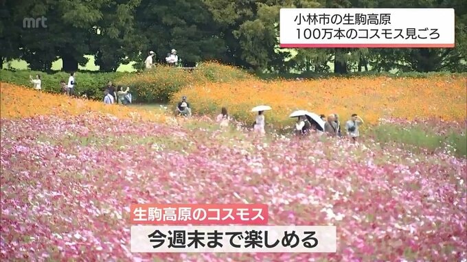 小林市の生駒高原 100万本のコスモスが見ごろ 2025年10月14日(火) 19:00 国内 小林市の生駒高原では、100万本のコスモスが見ごろを迎え、訪れた人たちを楽しませています。標高550メートルにある小林市の生駒高原。広さ12ヘクタールの敷地にはセンセーションやキバナコスモスなどおよそ100万…