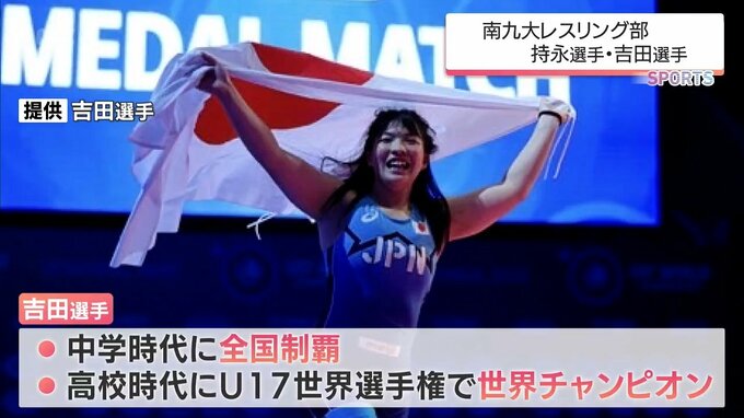 中学時代には全国制覇、高校時代にはU17世界選手権で世界チャンピオンとなった吉田選手。実はオリンピック3連覇を達成した吉田沙保里さんの姪で今年7月にもU20アジア選手権で銀メダルを獲得するなど、将来が期待されている一人です。