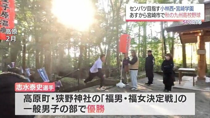 中でも注目の、1番バッターの志水選手は、今年2月に高原町の狭野神社で行われた「福男・福女決定戦」の一般男子の部で優勝した俊足の持ち主です。