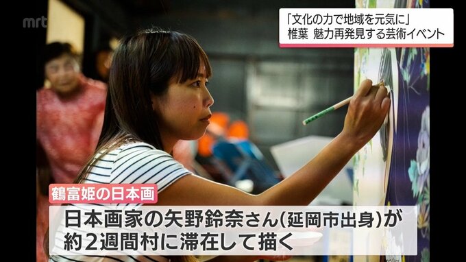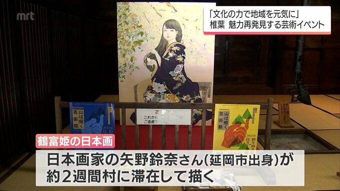 こちらの鶴富姫の日本画は、延岡市出身の日本画家、矢野鈴奈さんがおよそ2週間、村に滞在して描きました。
