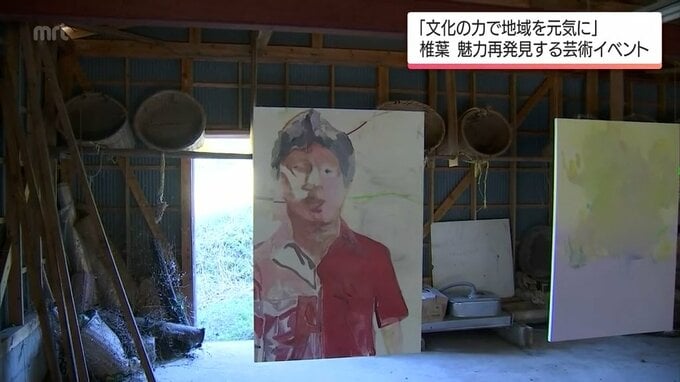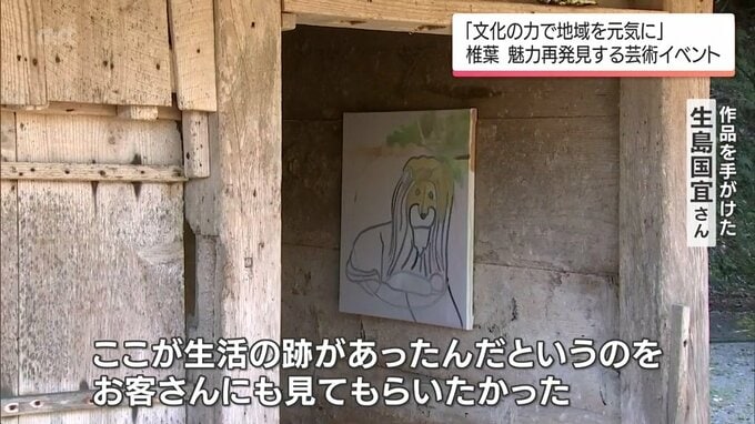 絵画作品が並ぶのは、道具がそのまま置かれたシイタケの乾燥小屋。