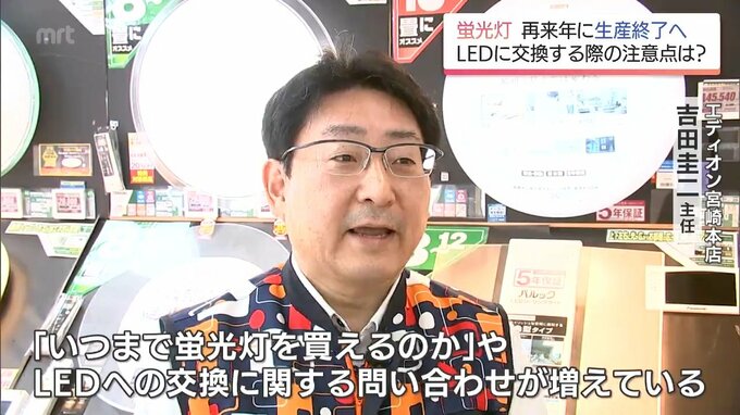 (エディオン宮崎本店・吉田圭二主任)「『いつまで蛍光灯を買えるのか』といったお問い合わせや、LEDへの交換に関するお問い合わせが増えています。この機会に器具ごとLEDに交換するお客様が増えている」