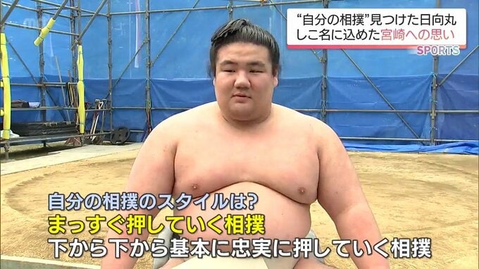 (日向丸)「真っすぐ押していく相撲で、下から下から基本に忠実に押していく相撲です。突っ張った時に状態が起きちゃうのを防ぐために下から押すようにしています」