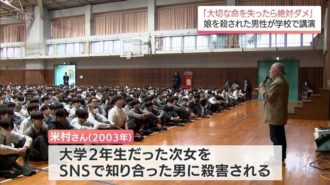 「大切な命を失ったら絶対ダメなんです」娘を殺害された男性 中高生に命の尊さを訴える 2025年11月11日(火) 19:08 国内 命の尊さを訴えました。SNSで知り合った男に娘の命を奪われた男性が、中学生や高校生を前に講演を行いました。宮崎市の宮崎学園で開かれた講演会。招かれたのは、くまもと被害者支援センター自助グループ「さくら…