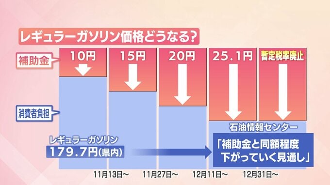 県内のガソリンの平均小売り価格は、今月10日時点で179.7円ですが、石油情報センターは「補助金と同額程度下がっていく見通し」としています。