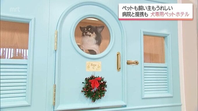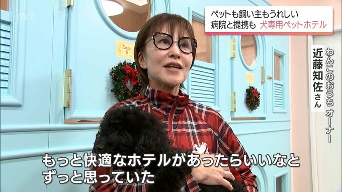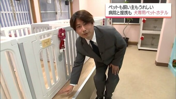「こちらのペットホテル、とてもかわいらしいデザインとなっていて、中もとっても色彩豊かな雰囲気。さらには、材質、例えばフローリング、こちらも肉球に優しい作りとなっていて、ワンちゃんたちが充実した時間を過ごすことができます」