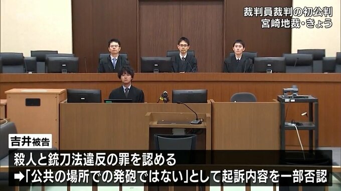 宮崎地裁で開かれている裁判員裁判の19日の初公判で、吉井被告は、殺人と銃刀法違反の罪について認めたものの、「公共の場所での発砲ではなかった」として起訴内容を一部否認しました。