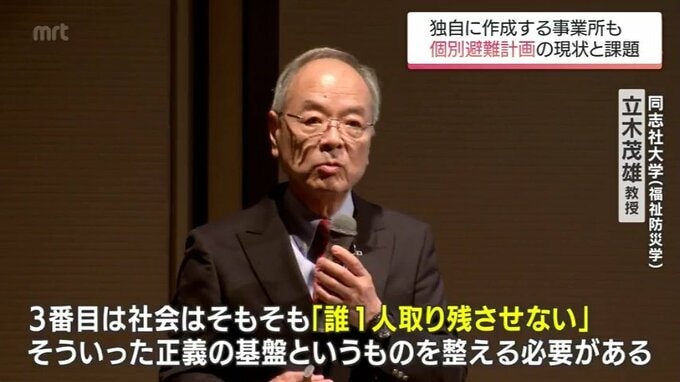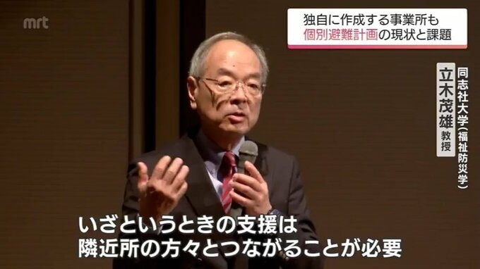 今月16日、宮崎市で開かれた講演会で福祉防災学が専門の同志社大学、立木茂雄教授は「地域」を巻き込むことが個別避難には欠かせないと強調しました。
