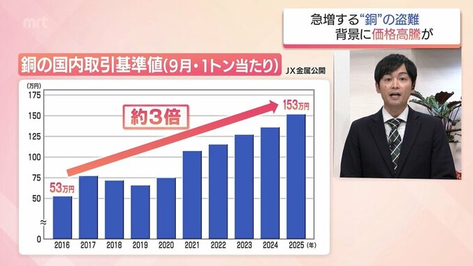 銅の国内取引の基準値なんですが、今年9月は1トンあたりおよそ153万円で、これは9年前の3倍近くにあたります。
