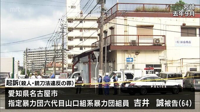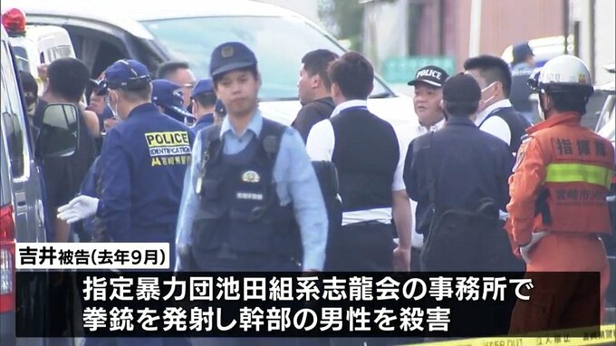 起訴状によりますと、吉井被告は、去年9月、宮崎市の指定暴力団池田組系志龍会の事務所で拳銃を発射し、幹部の男性を殺害したとして殺人などの罪に問われています。