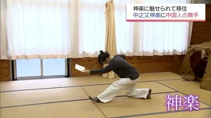 中国人のチョウ・イビンさん。熱心に練習しているのは、神楽の舞です。