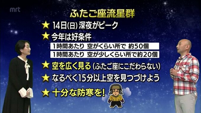MRTテレビ・ラジオで天気情報を担当する、気象予報士の野田俊一郎さんに「ふたご座流星群」観測のポイントを聞きました。