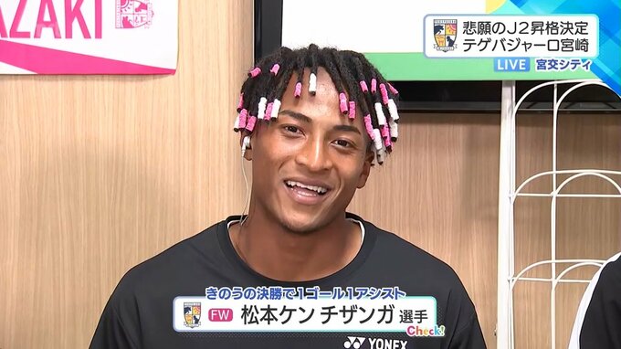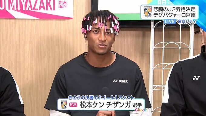 フォワードの松本ケン チザンガ選手は、この大一番に合わせて特徴的なピンク×白の髪型で臨みました。