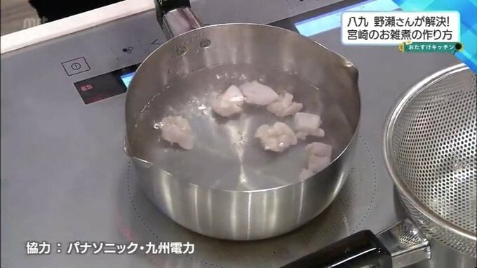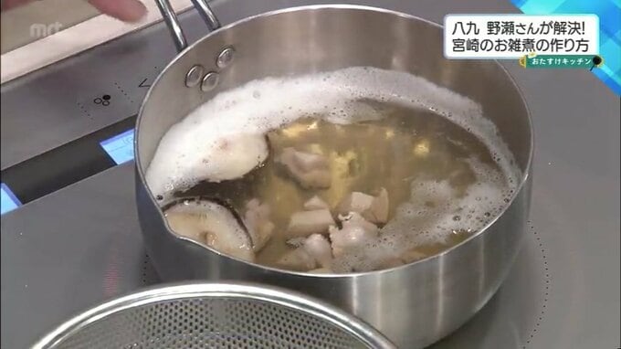 5. 下処理した鶏肉を出汁に入れて、3分程度、中火~強火で煮ます。これで鶏のうまみも出汁に出ます。