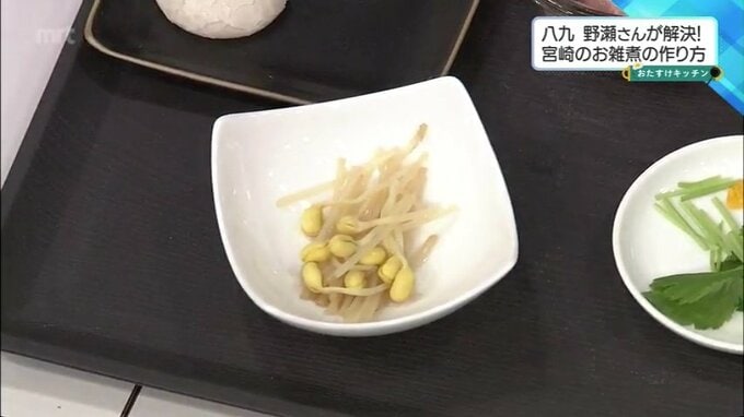 7. おやし(豆もやし)は、あらかじめ塩と薄口醤油を入れた湯で5〜10分ほど茹でておきます。